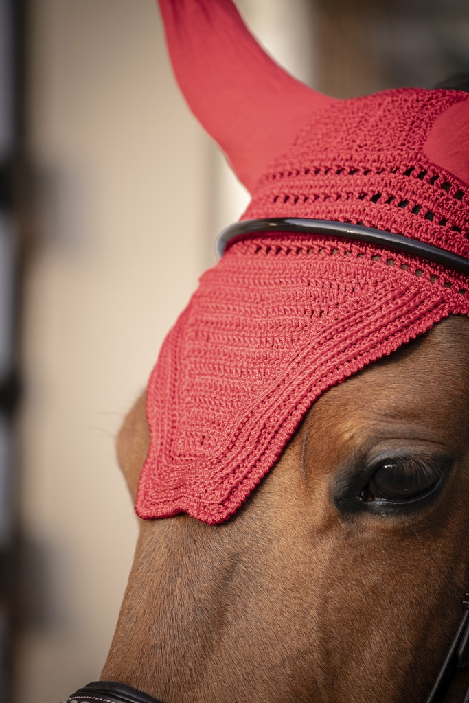 Prems horse Fly Veil. For a complete look, this fly veil perfectly matches the Prems saddle pads. Made of crocheted knit with soft and comfortable fabric ears, it minimizes unwanted noise and protects the horse from insects. Its style adds an aesthetic touch to the horse's look.