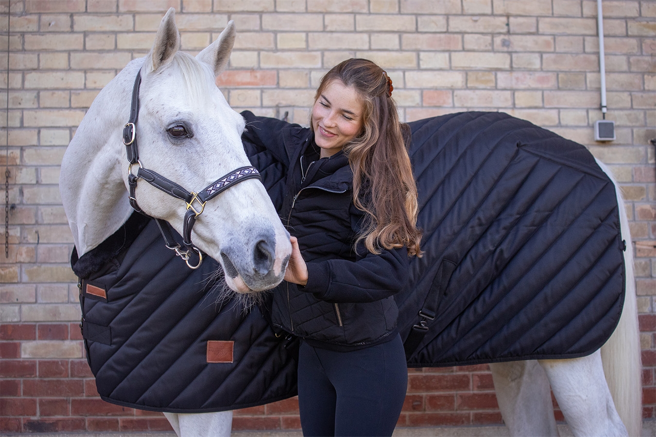 PADDOCK Sports Winter Stable Rug. Easily recognizable by its diagonal quilting, it provides a substantial 400g thickness of warmth for horses in the stall. For added comfort, a black synthetic sheepskin reinforcement is placed around the neck, adding a touch of elegance to this rug. It fastens with two buckles at the chest and features 2 cross surcingles and a tail strap.