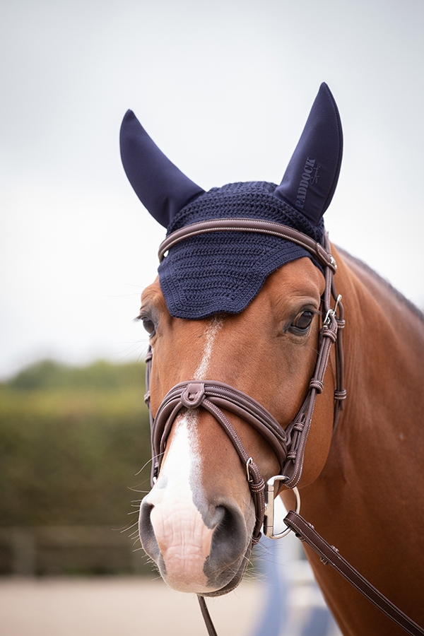 Bonnet haut de gamme crocheté avec un fil assez épais. Il se pose parfaitement sur la tête du cheval.