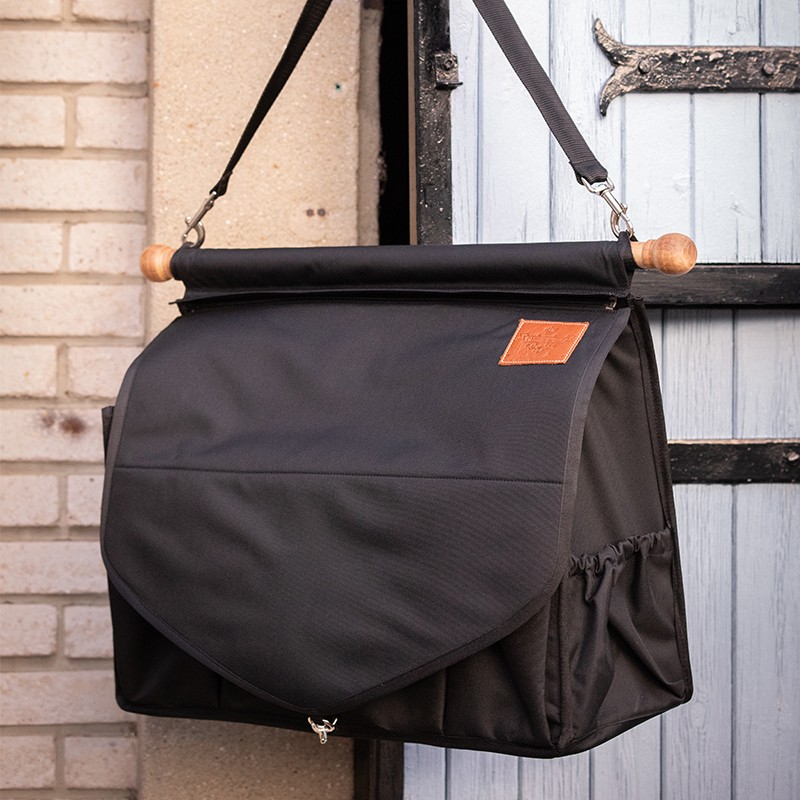 Très pratique et conçu pour transporter en concours ou ranger aux écuries, un maximum de matériel d'équitation. Le sac de box Paddock Sports est composé d'un rabat amovible (très pratique pour le personnaliser avec une broderie et pour l'entretenir) et d'une poche principale divisée en trois et renforcée dans le fond pour le rendre bien résistant et stable. Sur le devant, quatre poches supplémentaires sont disponibles pour recevoir des bandes de travail, de repos ou de polo. Sur les côtés, il y a aussi deux poches élastiquées pour recevoir encore plus de petit matériel. Le rabat se ferme grâce à un mousqueton argenté et un insert en simili cuir avec des ornements Paddock est cousu en haut à gauche. Il s'accroche par une lanière amovible reliée à une jolie barre de bois qui renforce, elle aussi, sa stabilité et sa résistance.