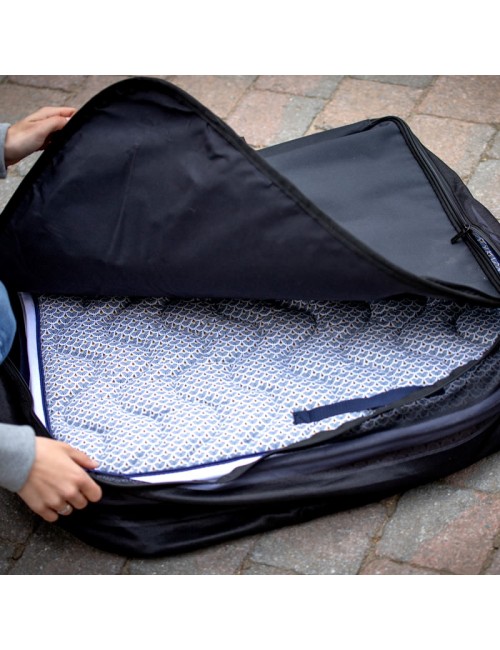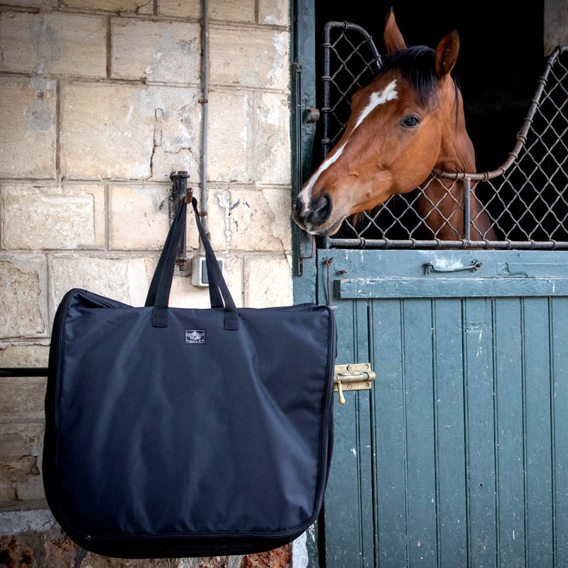 Très pratique, il est spécifiquement conçu pour stocker ou transporter vos tapis de selle. Il peut contenir jusqu'à 5 tapis mixtes ou de dressage. Il se ferme par zip sur 3 côtés pour faciliter le rangement. Sur les côtés, un tissu mesh permet une aération optimale des textiles. Il possède 2 grandes anses pour faciliter son transport ou l'accrocher facilement.