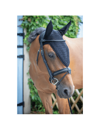 Décliné en version longue, ce bonnet en forme de V possède une petite attache de muserolle. Il est confectionné avec un tissage assez épais qui épouse parfaitement sur la tête du cheval. Ses oreilles sont stretch pour s'adapter parfaitement à toutes les morphologies. Le logo PADDOCK Sports est siliconé ton sur ton au niveau de l'oreille gauche.