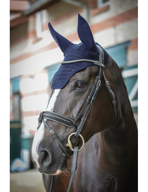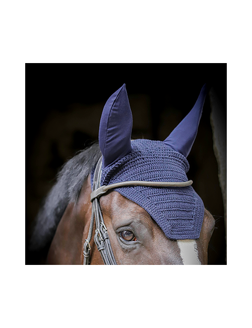 Original avec sa forme carrée sur le chanfrein, ce bonnet en tissage assez épais se pose parfaitement sur la tête du cheval.