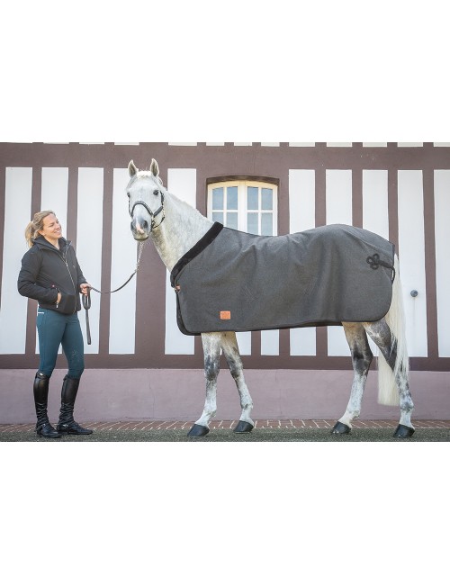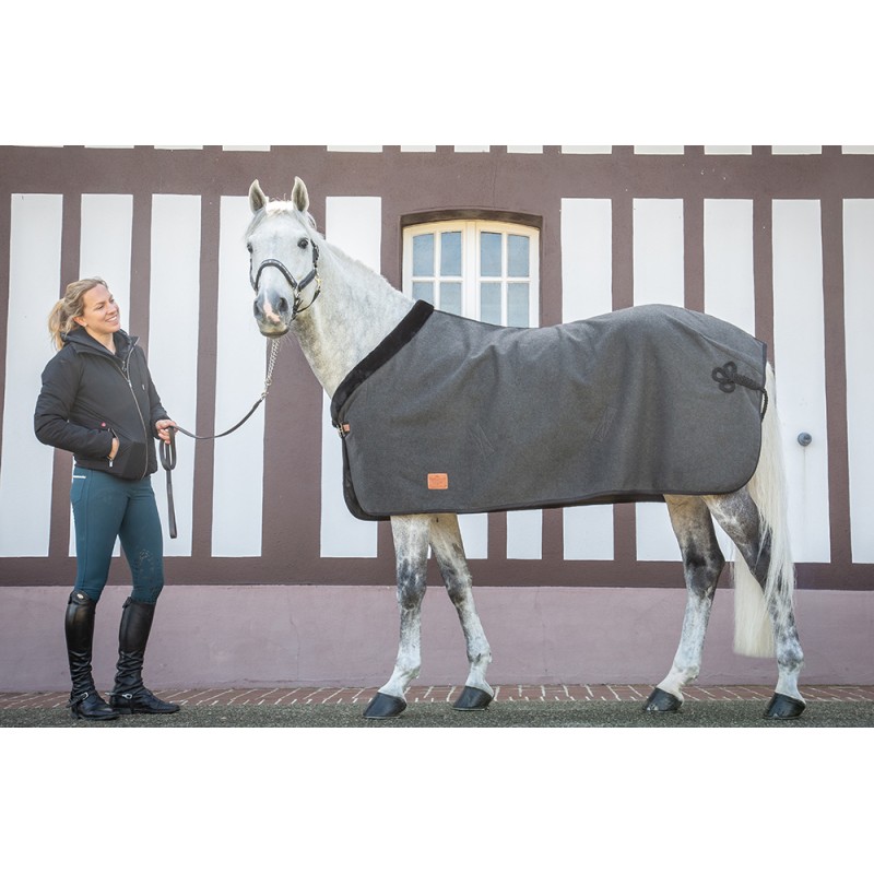 Couverture confectionnée dans une matière "touché laine" ornée d'un galon noir et d'une tresse de queue noire type brandebourg. Le long de l'encolure, un renfort en fausse fourrure noire protège une large zone autour du garrot et ajoute une touche de chic au produit. Sous le ventre, deux sangles croisées sont cachées et aident à garder la couverture bien en place. Sur le devant, la couverture se ferme par une boucle argenté. Sa belle épaisseur offre, par temps froid, une bonne source de chaleur. Son look sobre mais très chic permet une utilisation à la fois à l'entraînement mais aussi en concours.