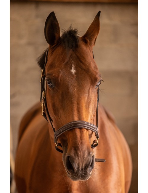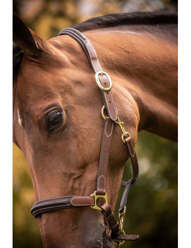 Pour un ajustement parfait, la têtière se règle des deux côtés grâce à deux grandes boucles, et la muserolle avec une boucle. La têtière est renforcée pour plus de confort sur la tête du cheval.