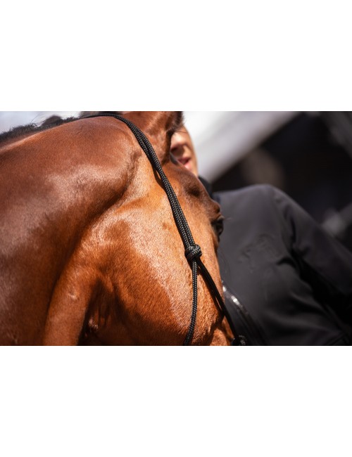 À l'extrémité du lien rond qui permet de fermer le licol par un noeud, le logo Paddock en contraste, est en blanc.