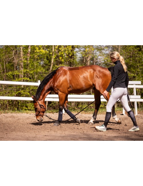 Longe Paddock Sports spécialement étudiée pour la manipulation du cheval au quotidien et la pratique de l'éthologie. Avec trois longueurs disponibles (250, 370 ou 600 cm), elles s'adaptent aux besoins des cavaliers et de leurs chevaux dans de nombreuses situations : manipulation simple, travail éthologique à pied, sortie et descente de camions et vans, débourrage, remise en confiance...