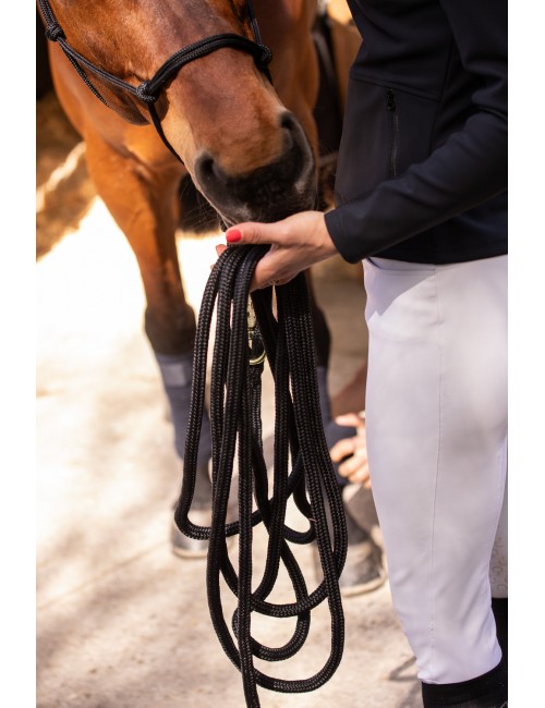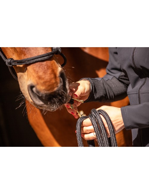 Elles sont fabriquées dans un nylon ultra solide et le mousqueton à l'extrémité est sécurisé par une fermeture rotative qui permet une grande liberté de mouvement lors de la manipulation. À l'autre bout de la longe, il y a deux jolies et fines lanières en cuir clair logotées Paddock Sports en contraste. Elles sont nouées à la longe par deux petites tresses qui apportent une touche de chic.