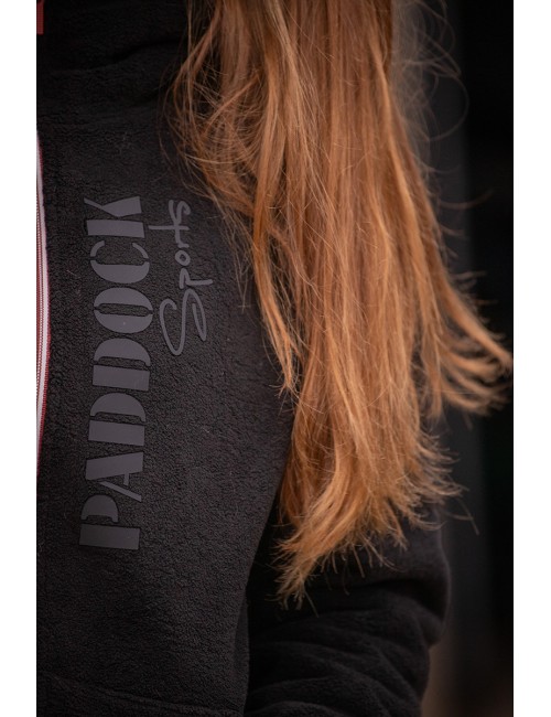 Un marquage PADDOCK Sports en gomme est posé à la vertical sur le devant, le long du zip. Sur la poche avant droite, un petit sceau PADDOCK couleur terracotta est collé.