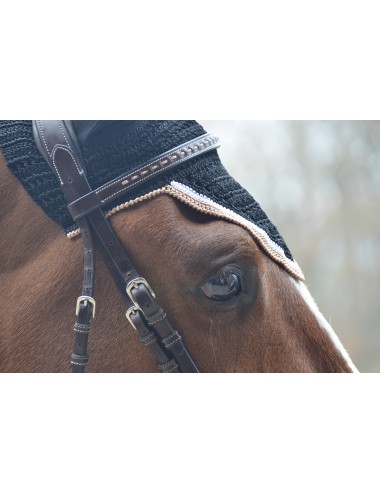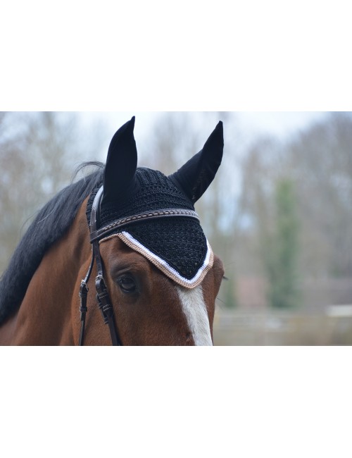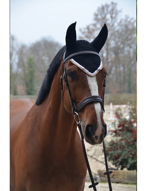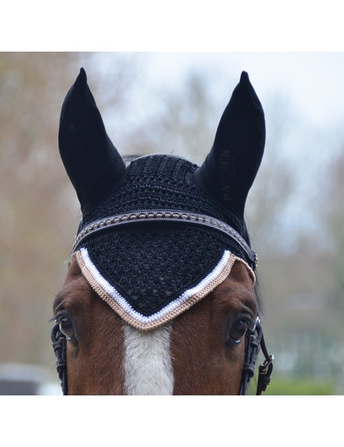A high end fly veil, with a thick weaving and a shape which perfectly goes on the horse's head. Nice V shape. Stretchy ears to fit any ears size or shape. To match with the Classic or Sports black Origine saddle pad.